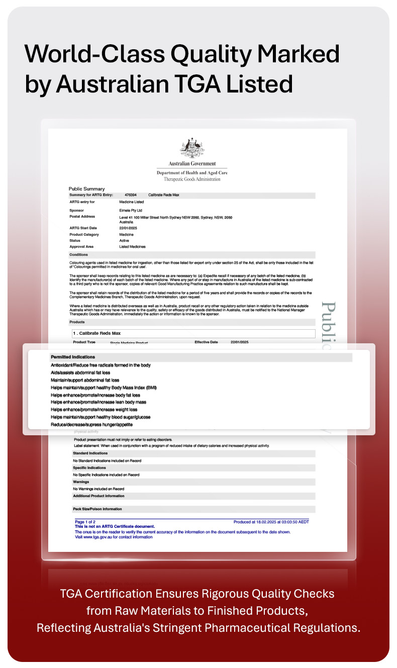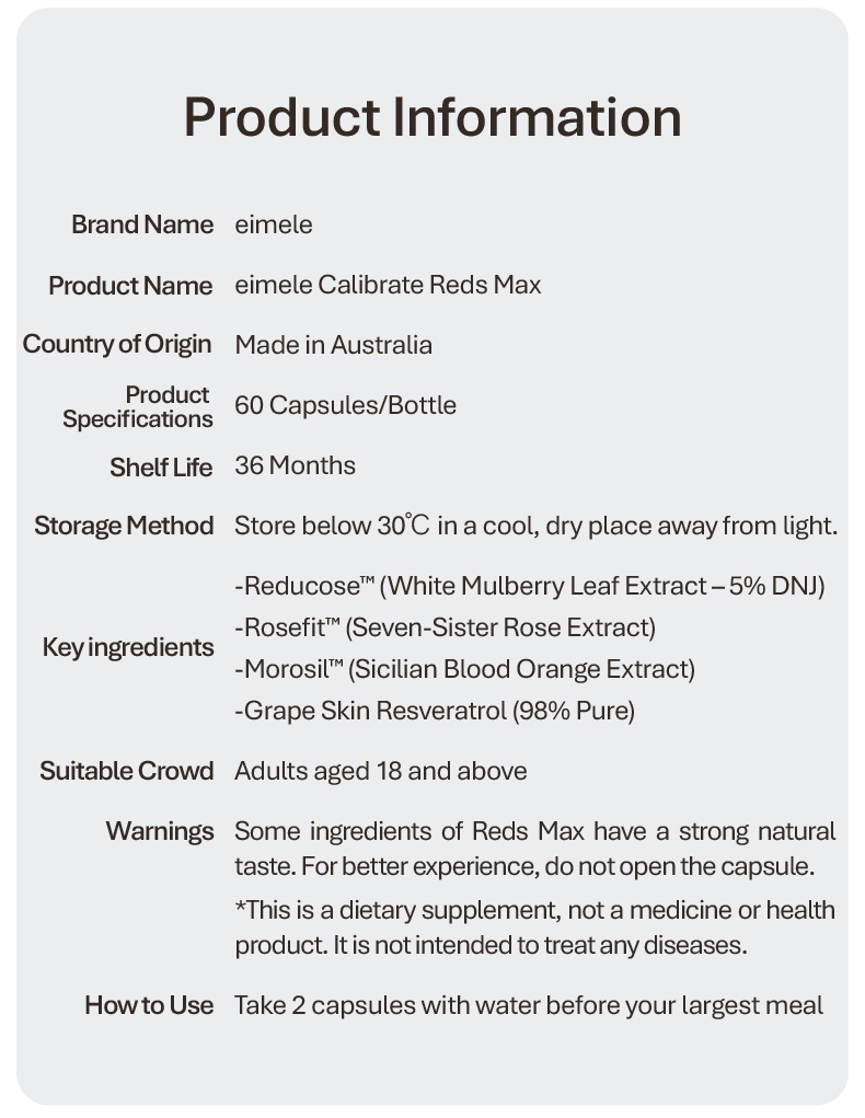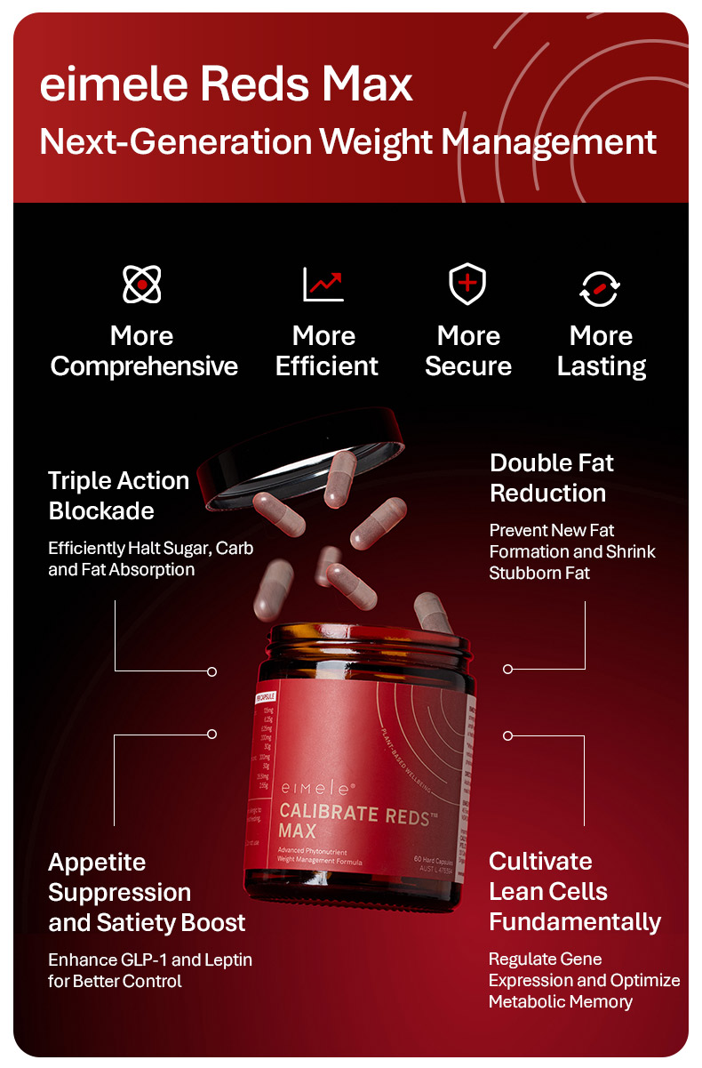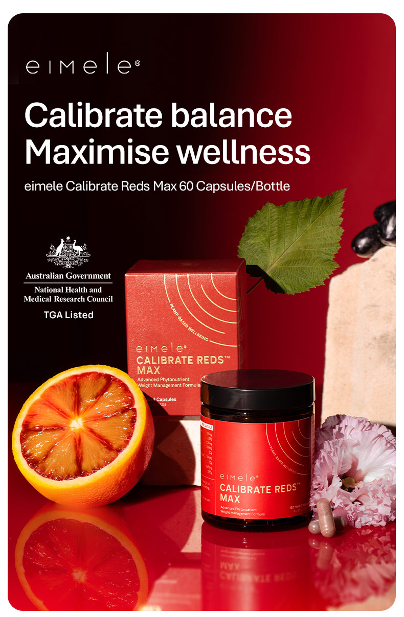 Eimele Calibrate Reds Max is formulated with a concentrated blend of antioxidant rich plant extracts to help support cellular health, circulation, and daily energy levels. The capsule format offers a simple, no mixing solution for busy lifestyles, while the complimentary Reds sachets allow for flexible daily intake and variety.